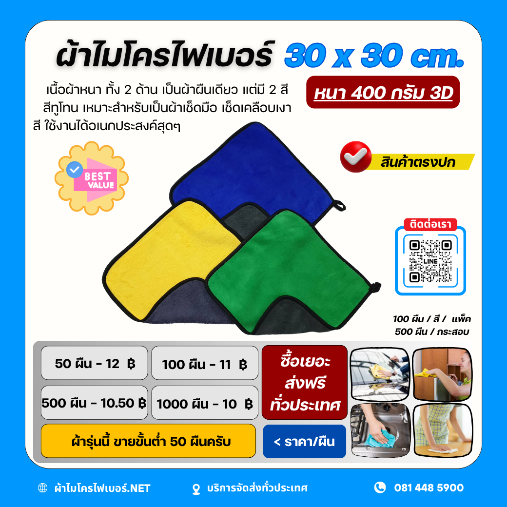ผ้าไมโครไฟเบอร์ 3D 30x30 cm. หนา 400 กรัม กุ๊นขอบดำกันรอยอย่างดีผ้าสีทูโทน สำหรับงานลงแว๊กซ์ เช็ดรถทั่วไป เช็ดมือ เช็ดงานครัว เช็ดอุปกรณ์